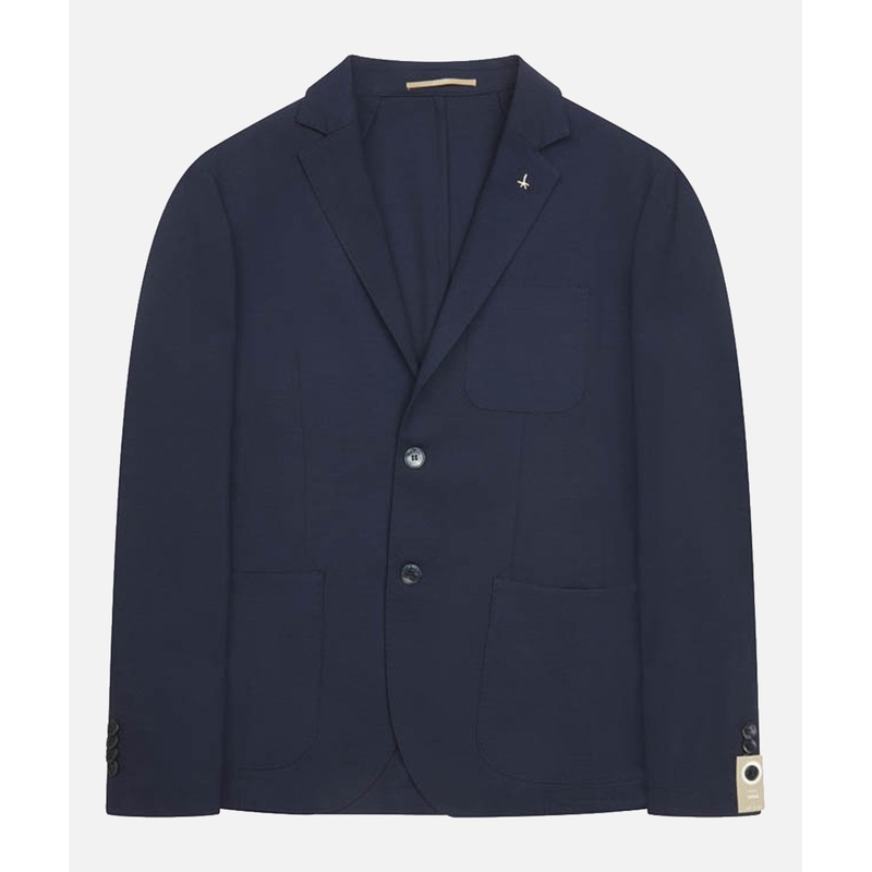 Two-button jacket in woven jersey. Model with patch pockets on the sides, patch pocket on the chest, sleeves with buttoned cuffs, lapel collar and bottom with slits on the back.