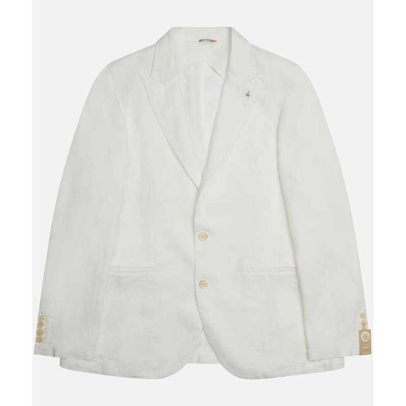 Two-button jacket, welt pockets and peak lapels. With double side slit. Made of pure linen fabric.