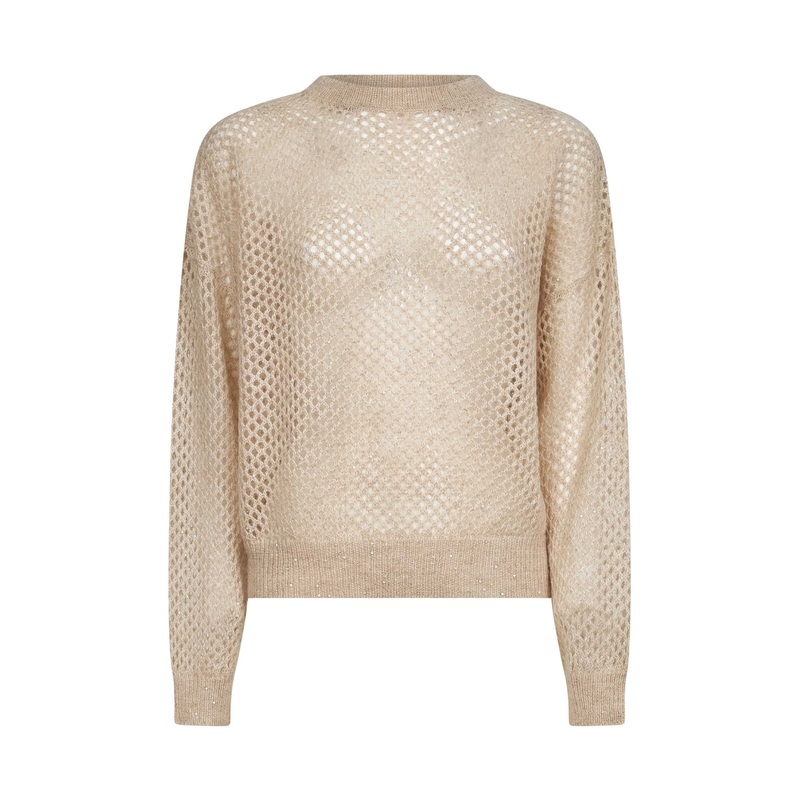 Ribbed crewneck Long wide sleeves, dropped shoulders Ribbed cuffs and bottom band Net knit design with small sequins embedded into the yarn Relaxed fit Beige color 42% Mohair, 30% Polyamide, 12% Cotton, 11% Wool, 5% Polyester Made in Italy
