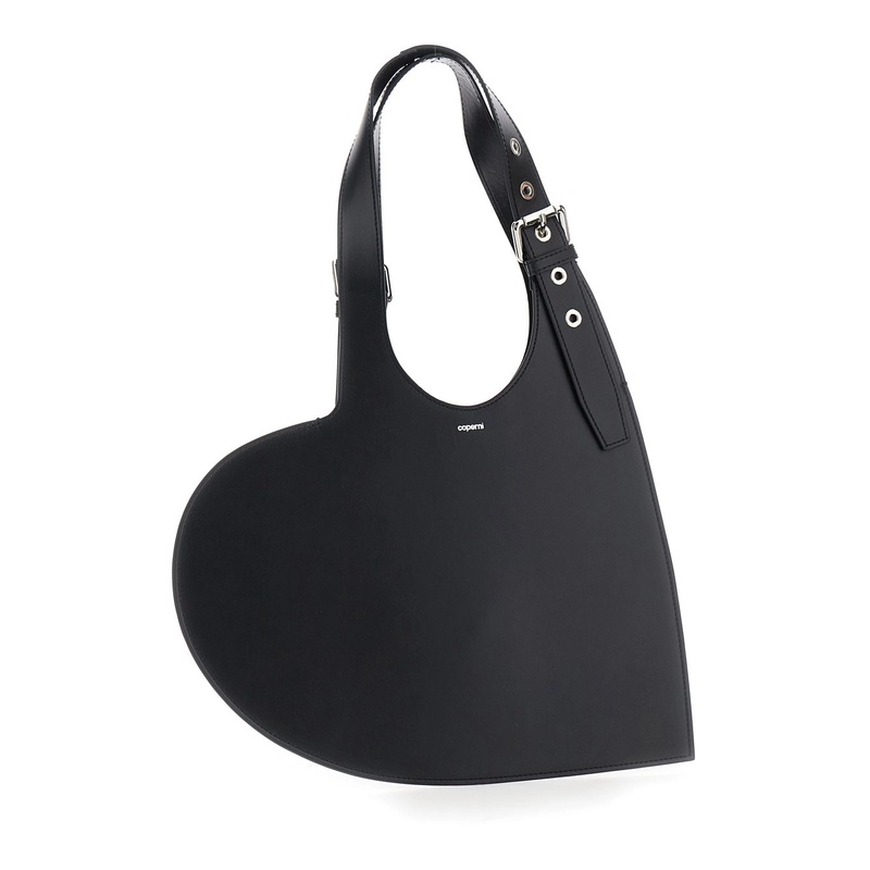 description" content="Handbag black heart shaped design adjustable belted handle cut-out on the handle logo lettering on the front silver tone metalware leather dimensions: 45x52 ...