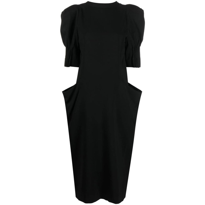 This elegant black wool blend dress from Bite Studios features a sophisticated mock neck and a stylish V-back design. The short puff sleeves add a touch of femininity, while the two side patch pockets provide practicality.Designed with a straight hem and m