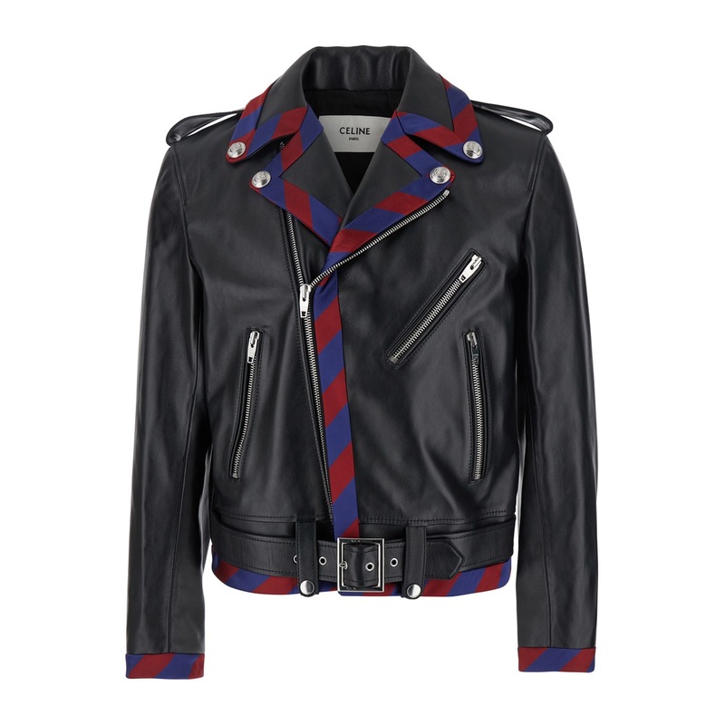 Black Biker Jacket with Striped Motif Details in Leather Man