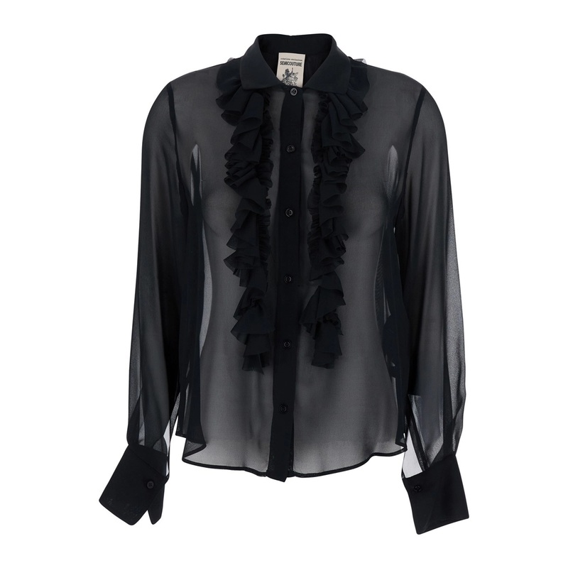 description" content=" blouse black classic collar long sleeves front button closure ruched detail on the front straight hem semi sheer design silk blend regular fit - Shop onlin ...