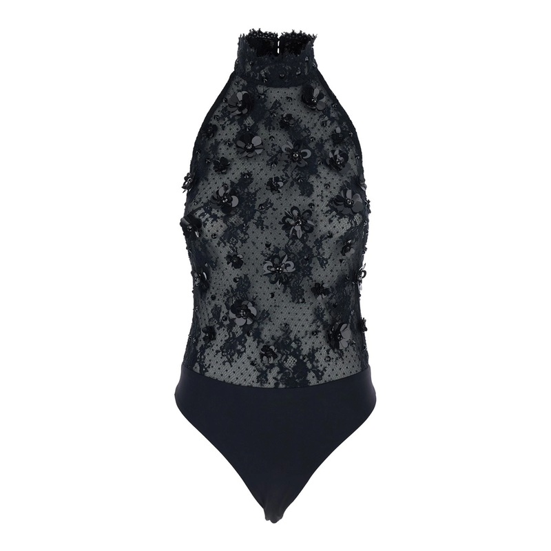description" content=" bodysuit black halterneck off-shoulder sleeveless rear closure open rear all-over floral embroidery sheer design tech fabric fitted shape - Shop online on ...