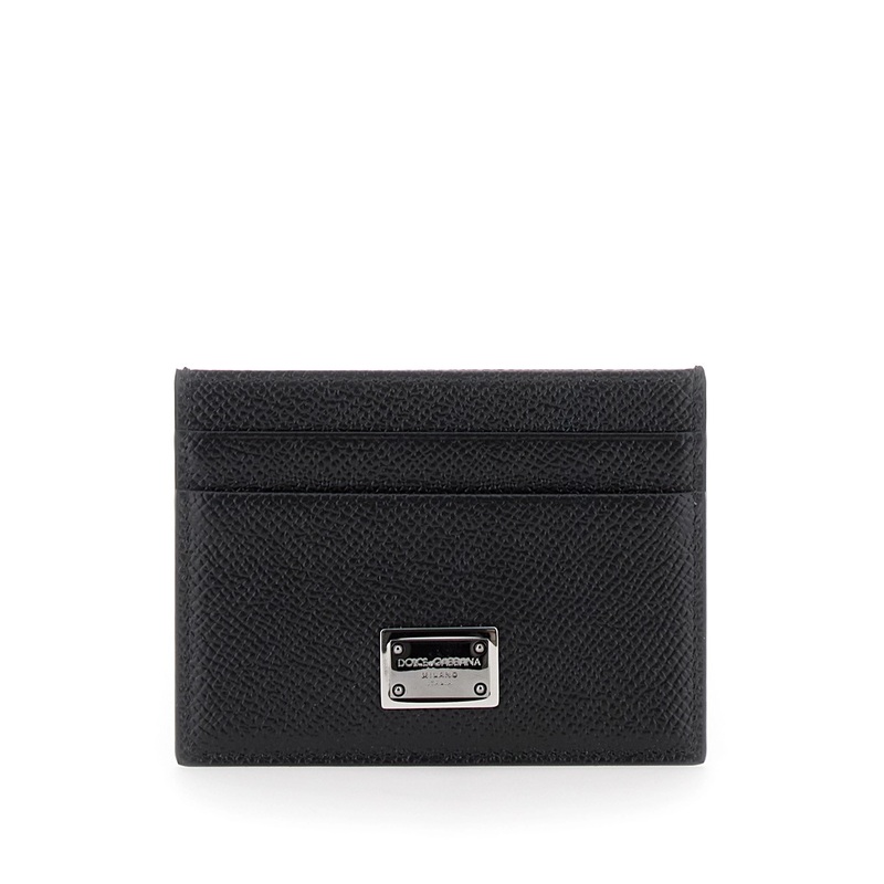 Black Card Holder with Logo Plaque on the Front in Grained Leather Man