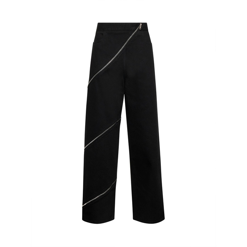 Asymmetric silver metal zip closure along the entire right leg lengthFront pockets, back patch pocketsStraight legBlack color99% Cotton, 1% PolyurethaneMade in Italy