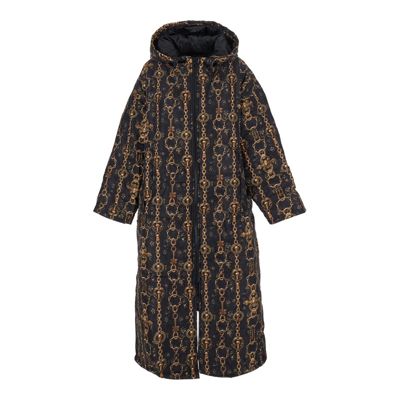 description" content=" down jacket black fixed drawstring hood long sleeves front zip closure all over print long design side pockets windproof, water-repellent, and breathable s ...