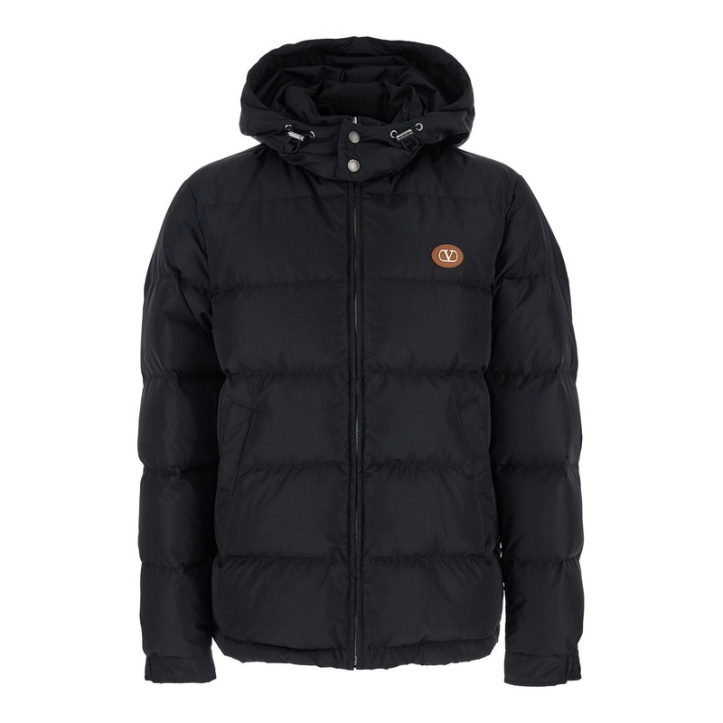 description" content=" down jacket black hood with drawstring long sleeves front zip closure two side welt pockets vlogo patch on the front padded and quilted tech fabric regular ...