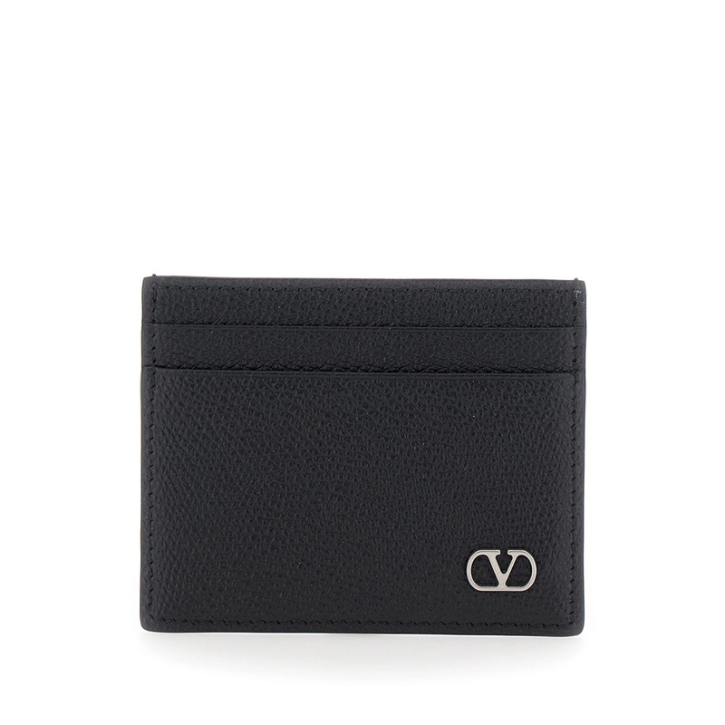 Black Horizontal Card Holder with VLogo Plaque on the Front in Grained Leather Man