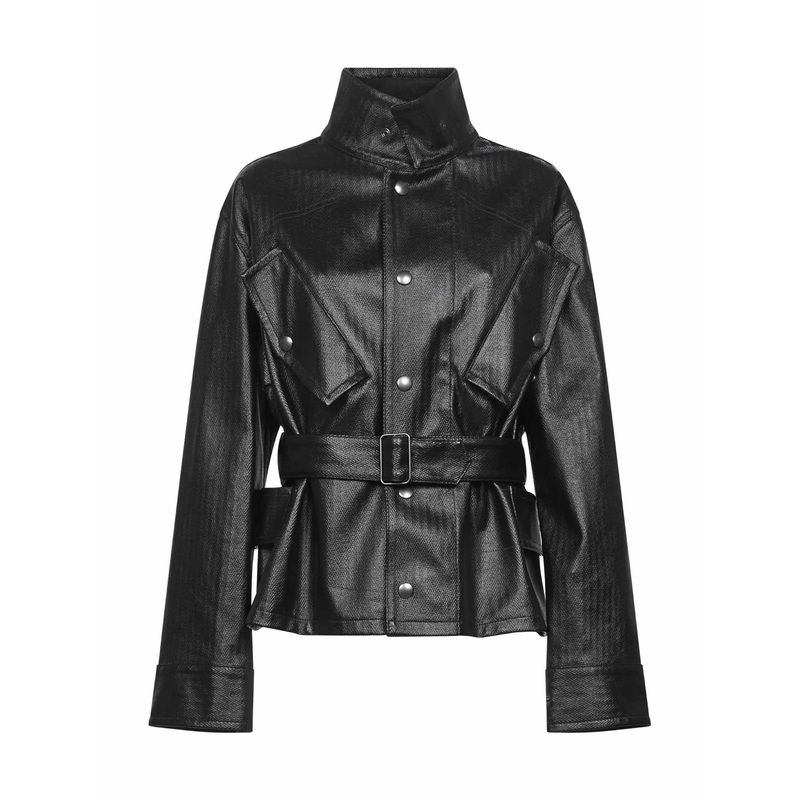 Front snap button placket High snap-buttoned collar Long sleeves, dropped shoulders, adjustable cuffs with snap-buttoned tab Four stitches at back Slanted welt pockets at chest with snap-buttoned flap Matching adjustable and detachable belt ath the waist w