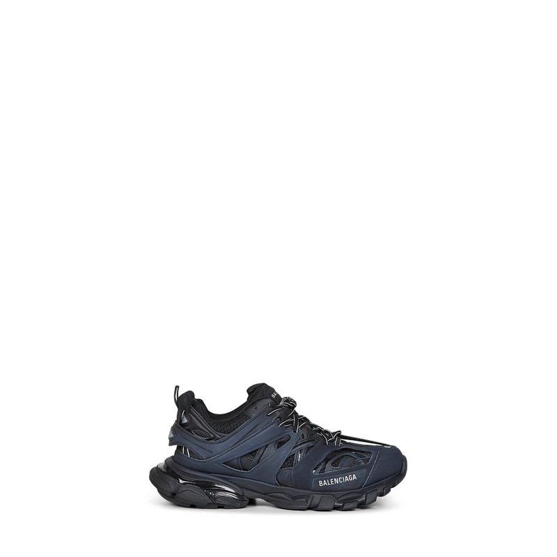 Front lace-up fastening; double laces Balenciaga logo embossed at tongue Written size at the edge of the toe Track lettering embossed at the back of the heel; back and tongue pull-on tab Black washed-effect nylon and mesh upper; contrasting Balenciaga logo