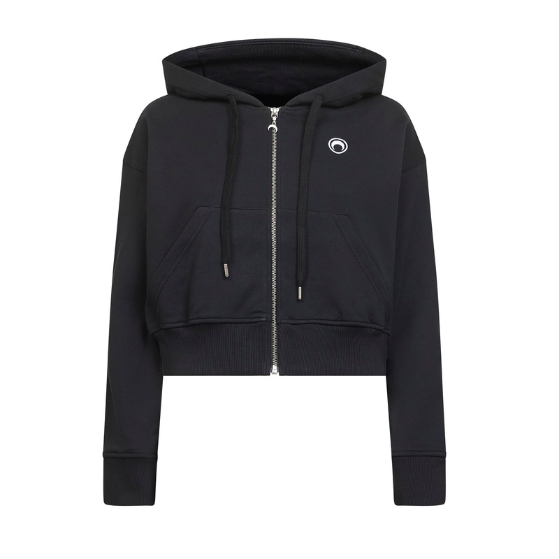 Front zip closure; metal Moon zip puller Three-panel hood with adjustable drawstring with metal aglets Long sleeves, dropped shoulders Contrasting Moon Logo embroidery at chest Front kangaroo pockets Ribbed cuffs and bottom band Cropped cut Black color 100