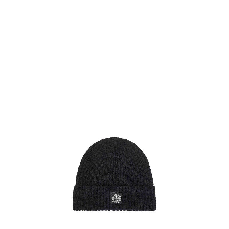 Turn-up hem; Stone Island Compass logo patch at front English rib knit virgin wool design Black color 100% Virgin Wool Made in Extra EU