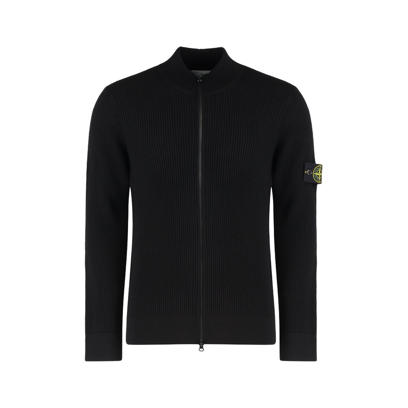 This stylish black ribbed sweater from Stone Island features a modern and minimalist design with a double slider front zip. Crafted with long sleeves and a high collar, it provides extra protection during cooler days. Made from high-quality wool, this swea