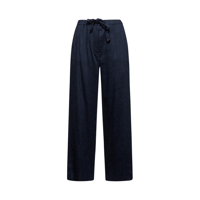 Covered front closureElasticated waistband with technical ribbon drawstringSide slant pocketsStraight legDenim-effect stretch linen and viscose twill designBlue color62% Linen, 35% Viscose, 3% ElastaneMade in Extra EU