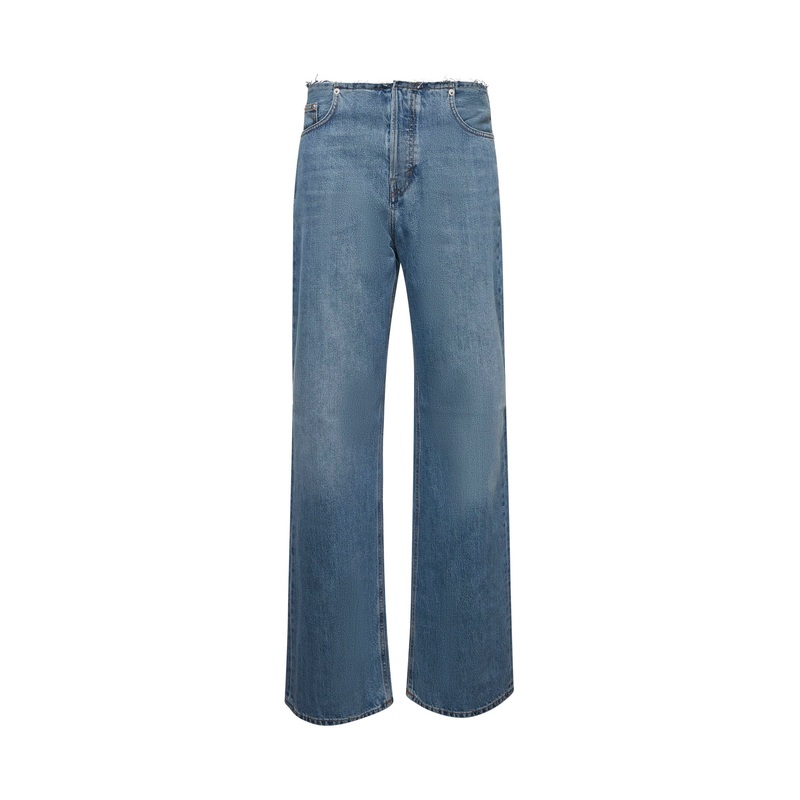 Covered front closure, metal logo button Raw-cut frayed mid-rise waistband; belt loops Five-pocket model Logo patch at back waistband Palazzo leg Mediterranean blue wash cotton denim design Relaxed fit Blue color 100% Cotton Made in Italy