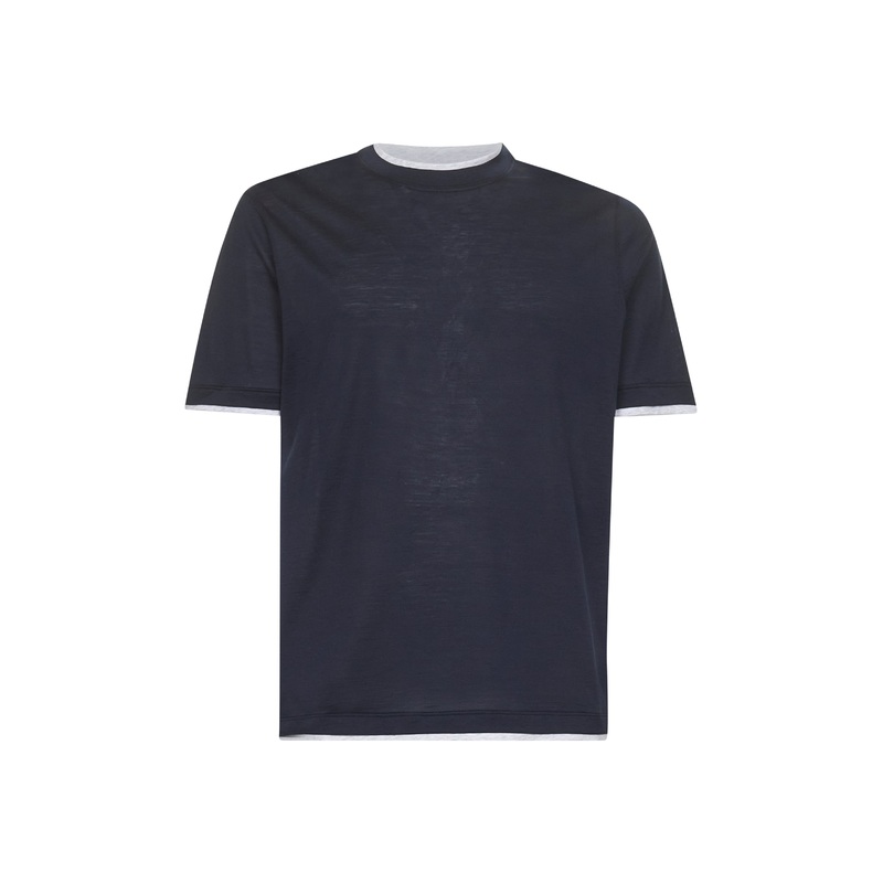 Crewneck Short sleeves Straight hem Layered-effect contrasting edge detailing at crewneck, sleeves and hem Regular fit Blue color 62% Silk, 38% Cotton Made in Italy