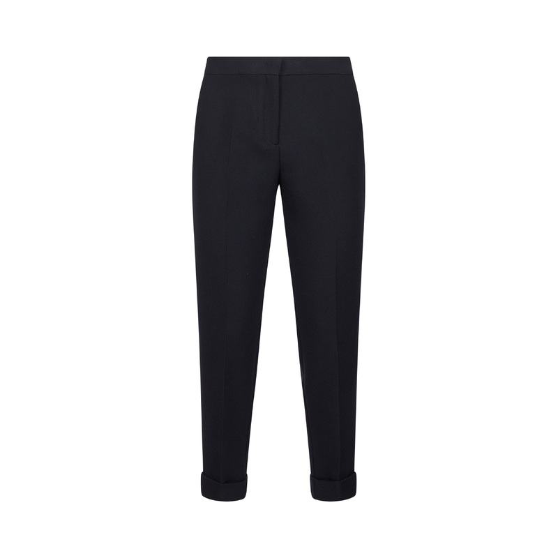Covered front closure Mid-rise waist Side pockets, back welt pockets Turn-up hems Pressed legs creases Cigarette fit Blue color 52% Polyester, 44% Wool, 4% Elastane Made in Italy