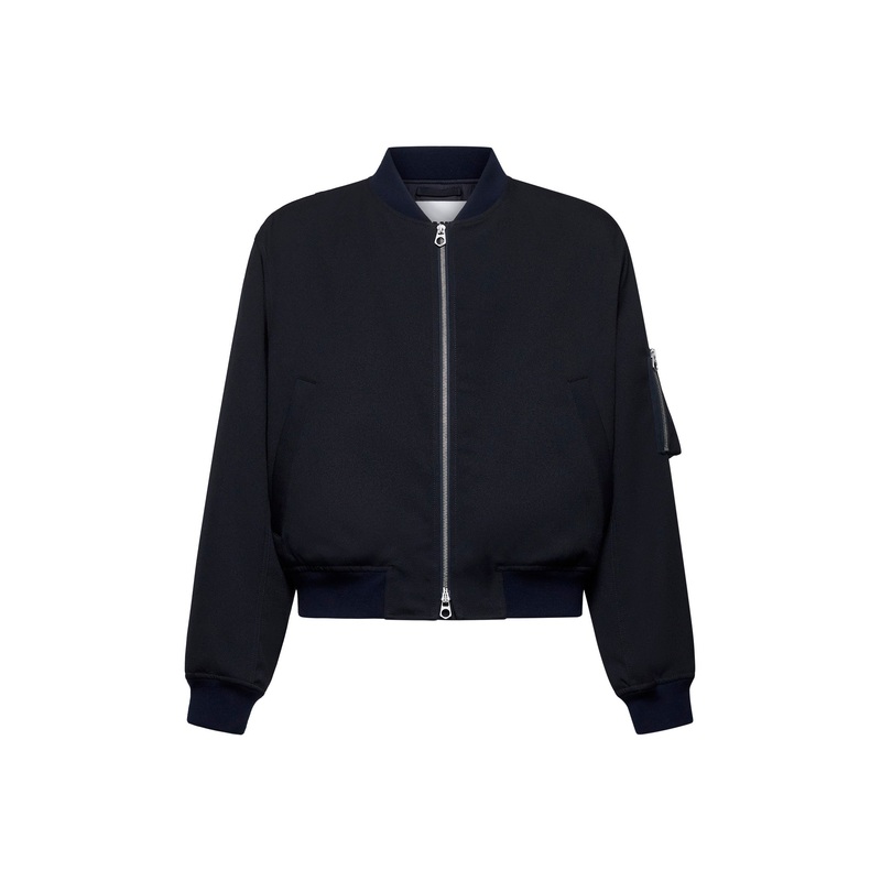 Front double-slider zip closure Ribbed knit bomber collar Long sleeves Side welt pockets, zipped patch pocket at left sleeve Ribbed knit cuffs and bottom band Lined; lightly padded Regular fit and boxy shape Blue color 100% Polyester Made in Italy