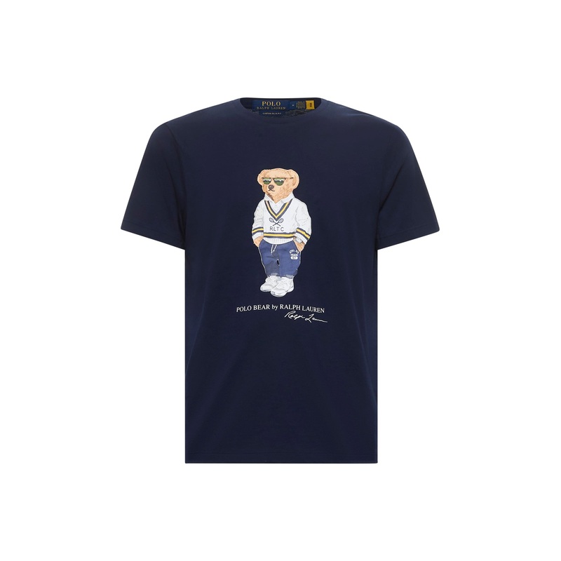Ribbed crewneckShort sleevesPolo Bear and Polo Bear by Ralph Lauren and Ralph Lauren lettering printed at frontCustom Slim-Fit fitBlue color100% CottonMade in Extra EU