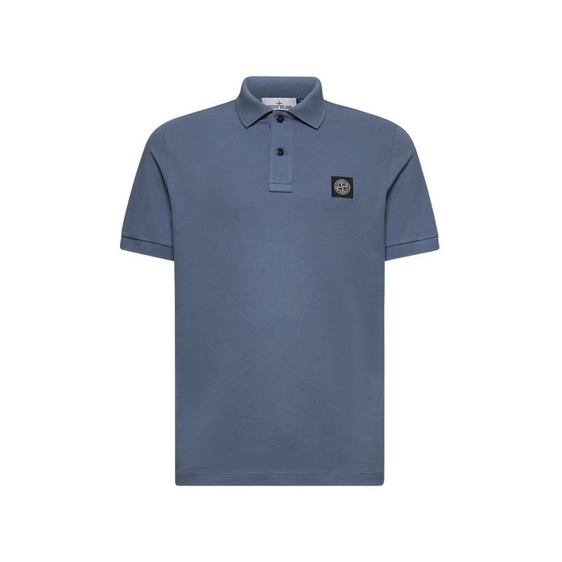 Front two-button placket Ribbed polo collar Short sleeves, ribbed cuffs Stone Island Compass logo patch at chest Side slits at bottom with striped tape Slim fit Blue color 95% Cotton, 5% Elastane Made in Extra EU