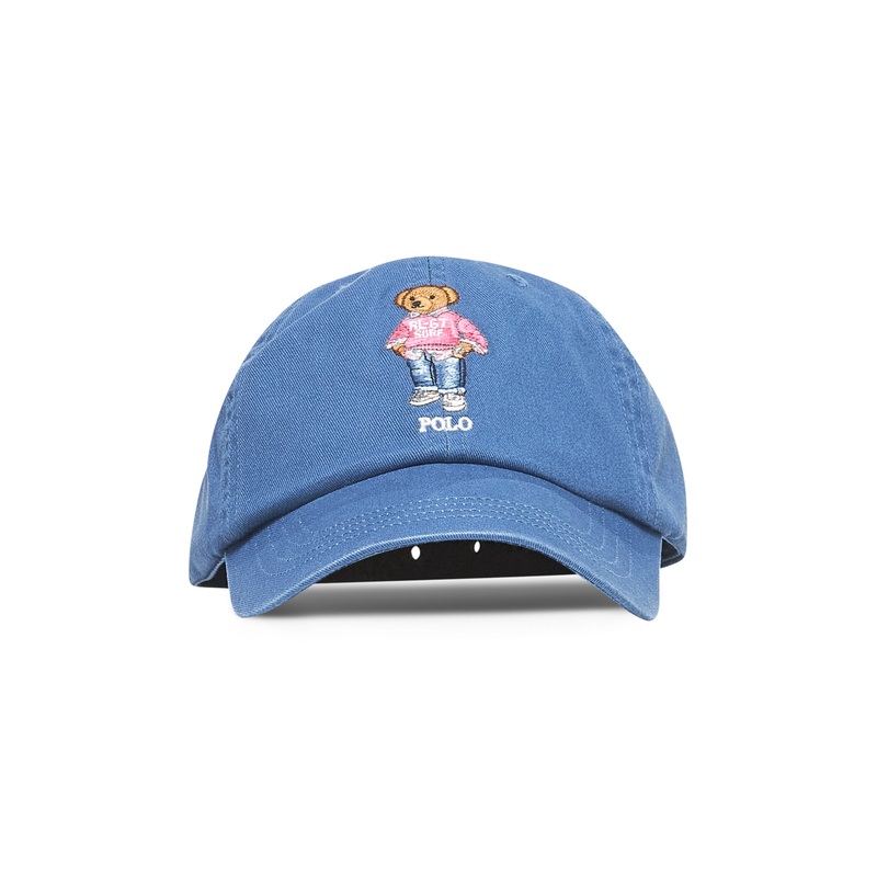 Adjustable back leather strap with metal bucklePolo Bear and Pololettering embroidered at front Contrasting Polo Ralph Lauren lettering embroidered at back Topstitched curved peakInner sweatbandSix-panel design; embroidered ventilation eyeletsBlue color100