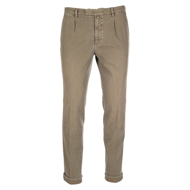 Stretch colored bull trousers with slub fabric. One pence, two front slant pockets and two back pockets, one of which with flap. finished bottom with turn-up. Made in Italy.