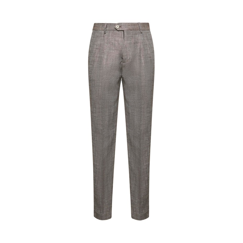 Front with zip fly and button closureWaist with belt loopsSide slant pockets, back welt pocketsDouble front pleatPressed legs creasesTapered legSilk, linen and cotton chevron designLeisure fitBrown color38% Silk, 36% Linen, 16% Cotton, 10% PolyamideMade in