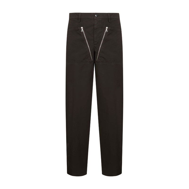 Front zip fly and button closure Waist with belt loops Front bellows pockets with metal zip closure, back welt pockets Side metal zip at legs bottom Straight leg Brown color 100% Cotton Made in Romania
