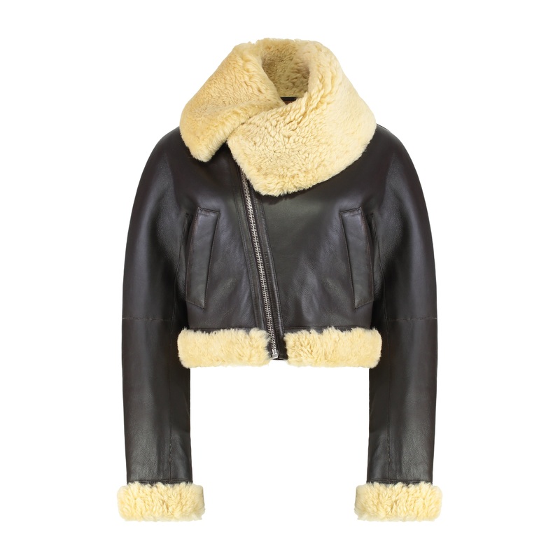 Brown leather short jacket featuring luxurious lamb shearling double-face details.This exquisite piece boasts an asymmetric collar made of fur, complete with an adjustable strap for a tailored fit. The design includes an oblique zip front closure and side