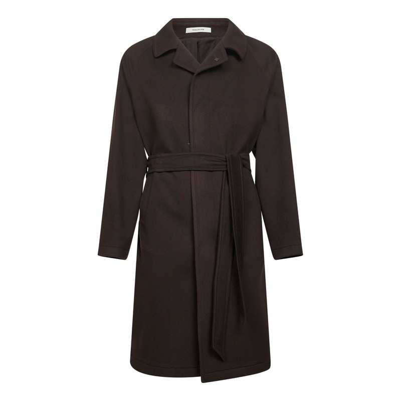 A refined wrap coat crafted from a luxurious brown wool and cashmere blend, designed for timeless elegance and everyday refinement. The silhouette is defined by a lapel collar with a matching undercollar and a covered front button placket for a clean, tail