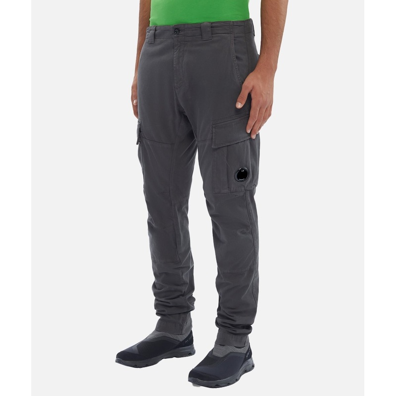 Garment-dyed ergonomic fit trousers with two large cargo-style pockets, one of which with C.P. Company Lens. They also feature belt loops and a button and covered zip closure.