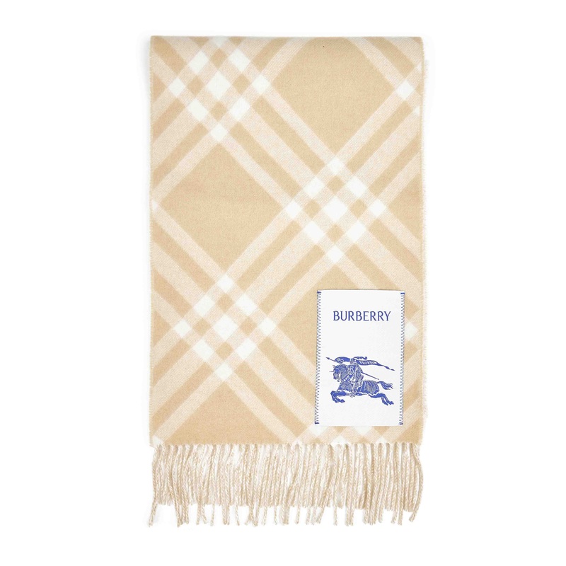 "Check" scarf by Burberry Beige wool and silk on one side, white on the other Front logo label Rectangular shape with fringed ends Made in Extra-EU