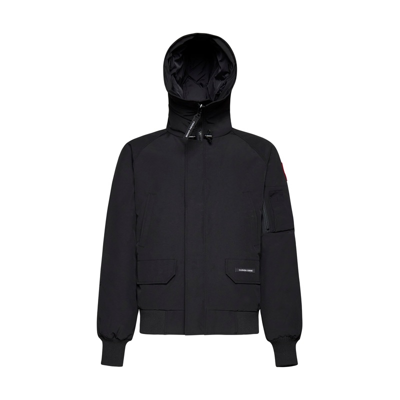 Black polyester and cotton bomber Hood with adjustable drawcord and buckle Front zip and button closure Four front pockets, Canada Goose logo on the front Zip pocket and open pockets on the sleeve Logo patch on the sleeve Elasticated hem and cuffs Internal