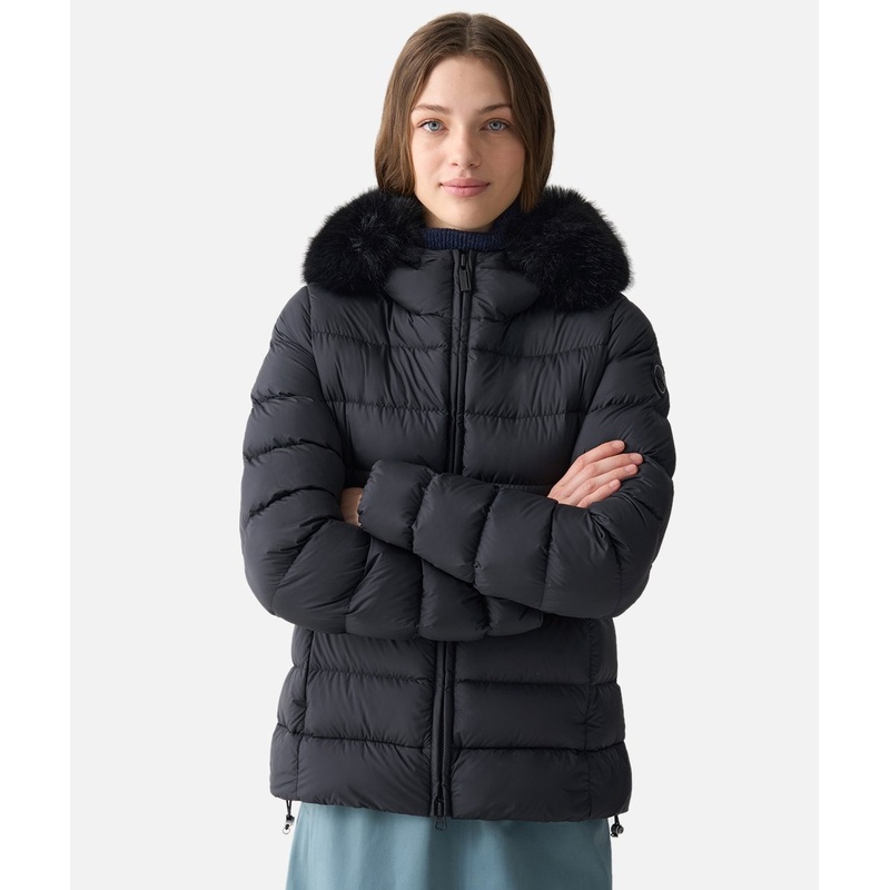 A perfect harmony, this women’s jacket with hood and faux fur is the ideal garment for facing the cold season with elegance, thanks to the soft microfibre, side pockets and adjustable drawstring at the hem.