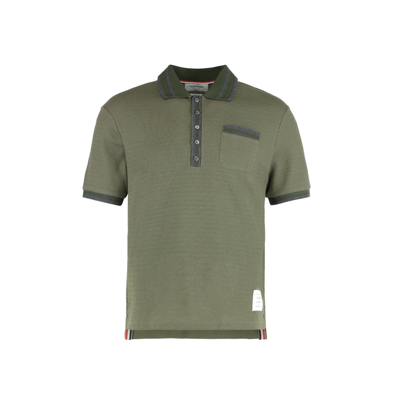Short-sleeved polo crafted from luxurious green cotton knit, designed to elevate your casual wardrobe. It showcases a ribbed collar and a refined button closure for that classic touch.Featuring a convenient pocket on the front along with a discreet logo la