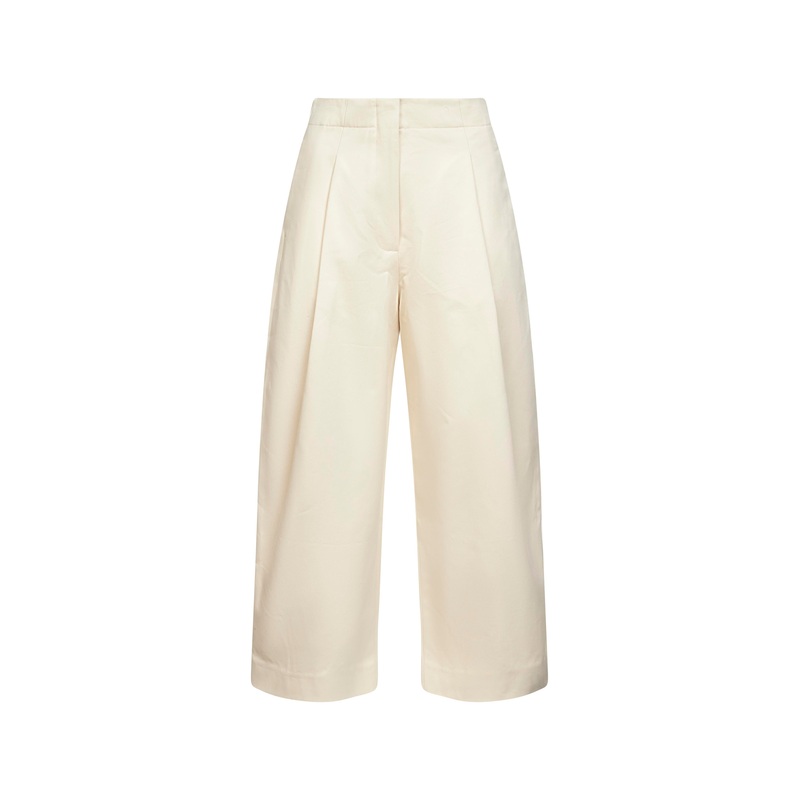 Covered front closure High waist; drop crotch Side in-seam pockets, back welt pockets Deep single front pleat Voluminous cut with curved leg Cropped length Cream color 100% Cotton Made in Portugal