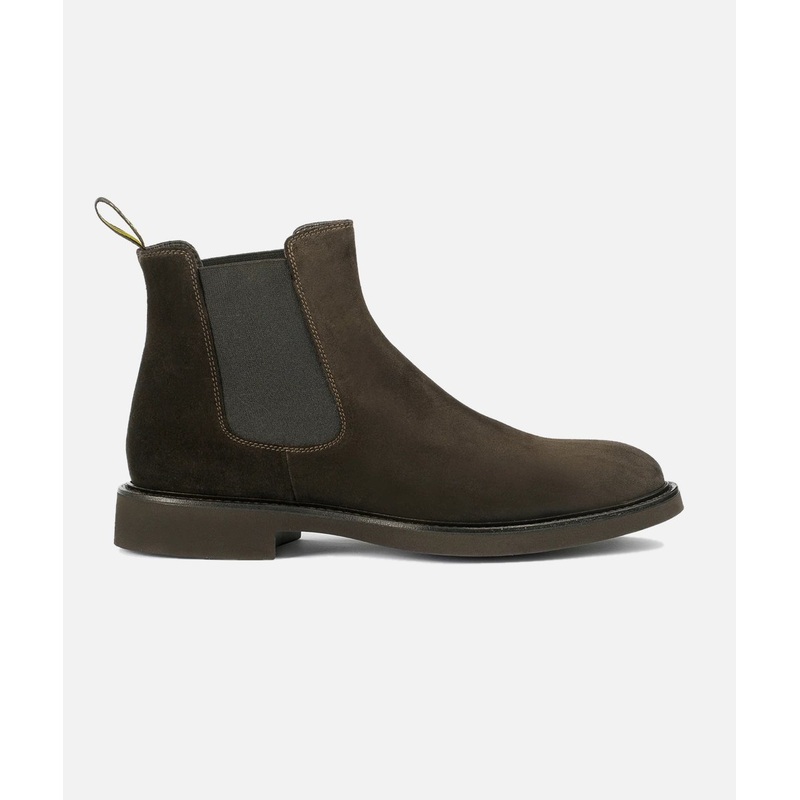 Brown suede Beatles-style ankle boots with matching elastic bands and rounded lines, easy to wear and extremely comfortable. Needlework with rubber sole. Made in Italy.