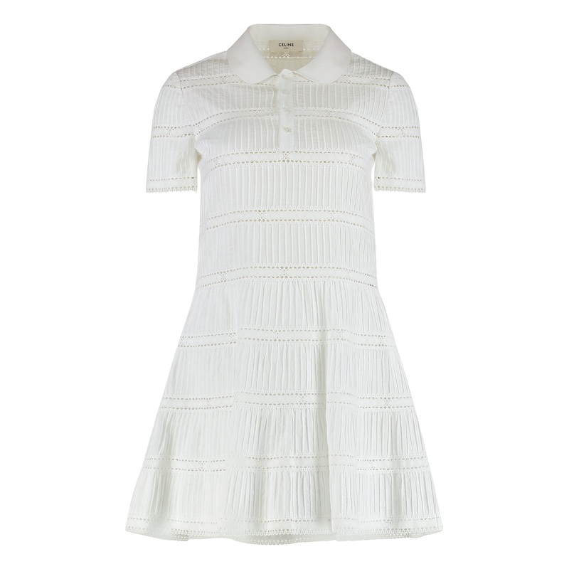 This dress is characterized by a trapeze silhouette and fish scale embroidery Triomphe. The classic collar adds a refined touch, while the slightly flared skirt offers comfort and freedom of movement. Made from a lightweight material, it is ideal for summe