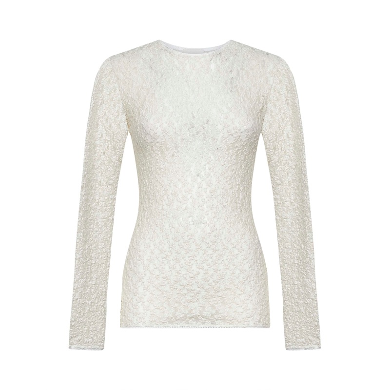 Crewneck Long sleeves Notched trims at edges Floral patter stretch lace design Fitted fit Ecru color 52% Polyamide, 46% Cotton, 2% Elastane Made in Portugal