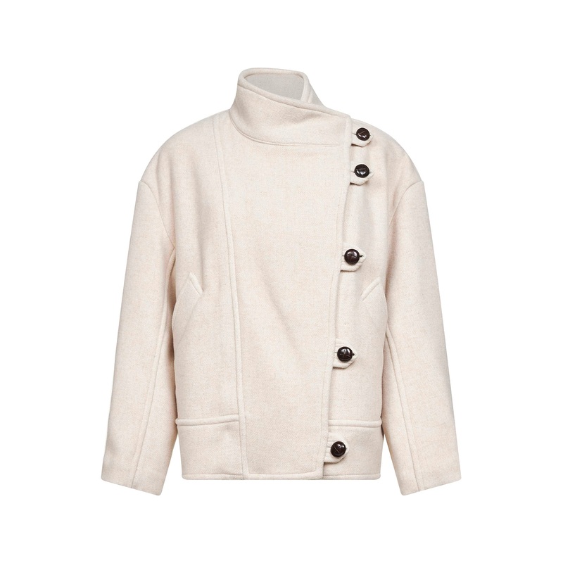 Asymmetric front button placket Stand collar Long sleeves, dropped shoulders, adjustable cuffs with buttoned tab Diagonal side welt pockets Unlined Woven buttons Balloon fit Ecru color 75% Wool, 25% Polyamide Made in Poland
