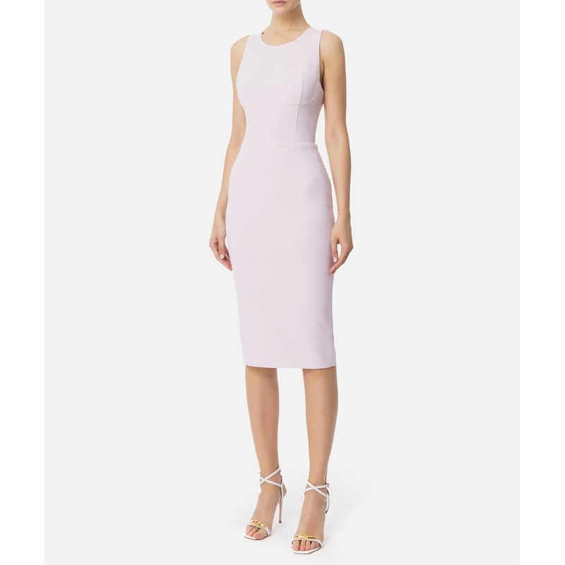 Sleeveless dress in stretch crepe with a sheath line. The dress stands out for its graphic style: the contrasting piping details recreate a bustier with a trompe-l'oeil effect. Pencil skirt with a slit on the back and knee length. Tight fit.