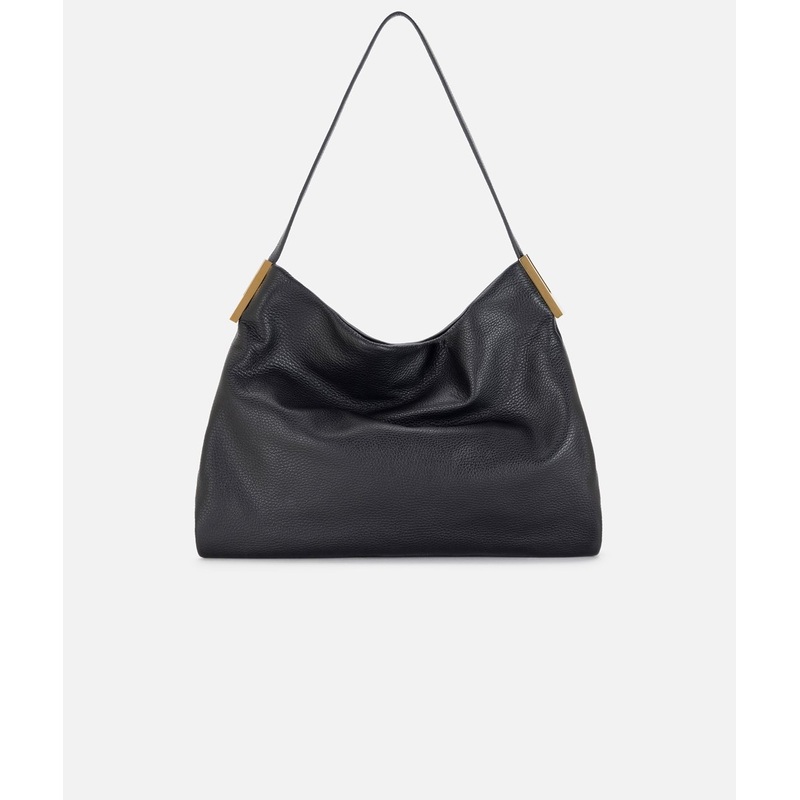 Tote bag made of leather. With a simple and elegant shape, it is embellished with gold-tone metal side details. Logo at the bottom.