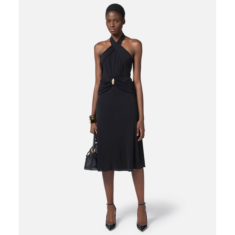 Light jersey dress. The dress has bare shoulders and stands out for its crossed neckline that creates a deep and sensual slit on the bust. A touch of light is given by the jewel detail at the waist enriched by a pav of rhinestones and the logo. Tight fit.