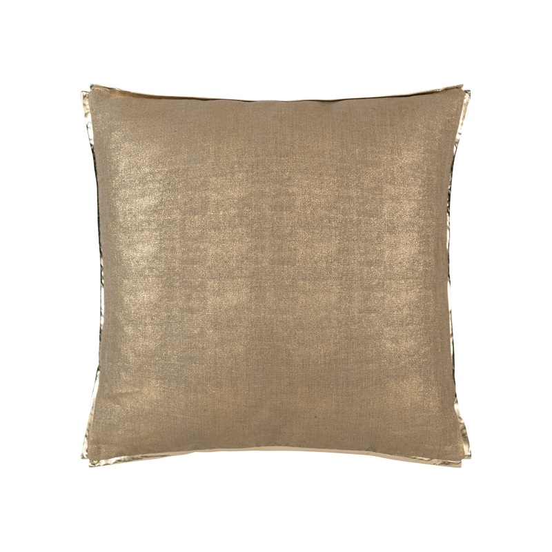 This is a natural linen Ella with a gold foil finish and a faux leather gold flange along the edges. This luxurious pillow is a perfect base pillow for any collection.