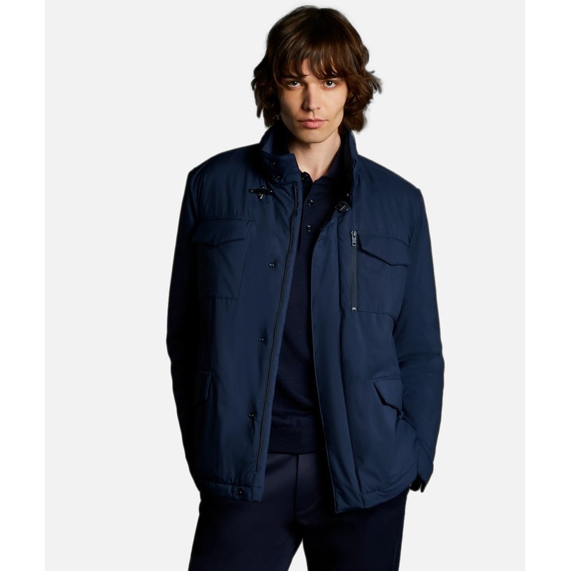The charm of the field jacket is indissoluble, even in its wintery variations. This wadding-padded version is made of water-repellent satin technical fabric with a removable hood and flap and snap pockets. The upper left pocket has a second vertical entran