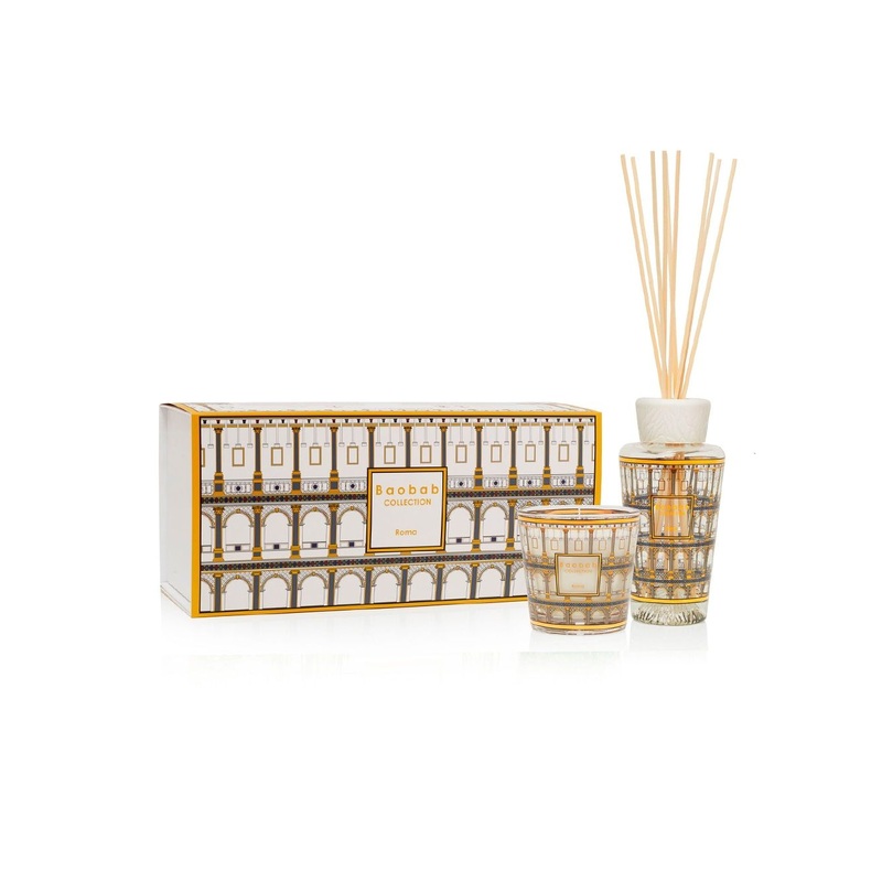 Discover the art of luxury home fragrance with the Gift Box My First Baobab Rome from Baobab Collection. This exquisite gift set features beautifully crafted candles and a reed diffuser, all adorned with the brand's signature gold geometric patterns inspir