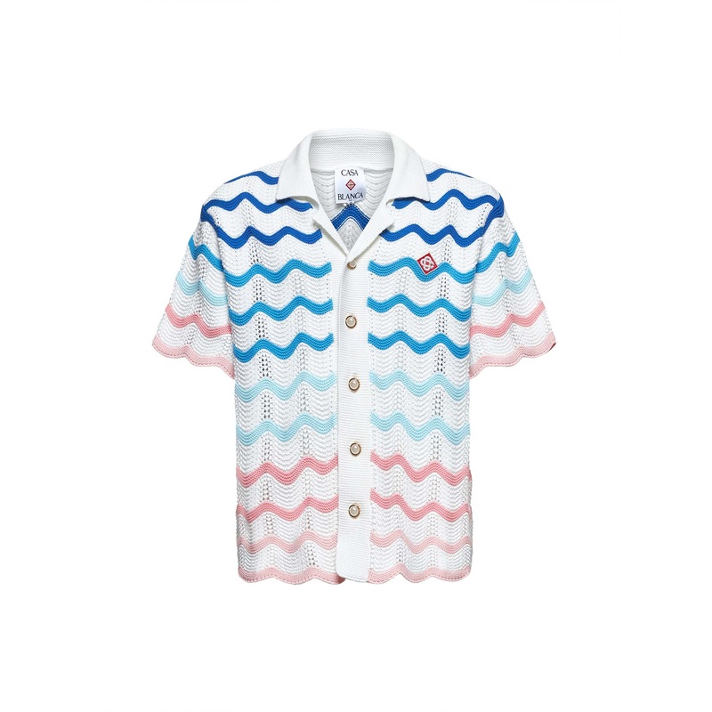 Front gold rim signature pearl buttons placketCuban collarShort sleevesRed diamond logo patch at chestAll-over multicolor wave patternWave pattern edge detailCrochet cotton designRegular fitColor: multicolor100% CottonMade in Extra EU