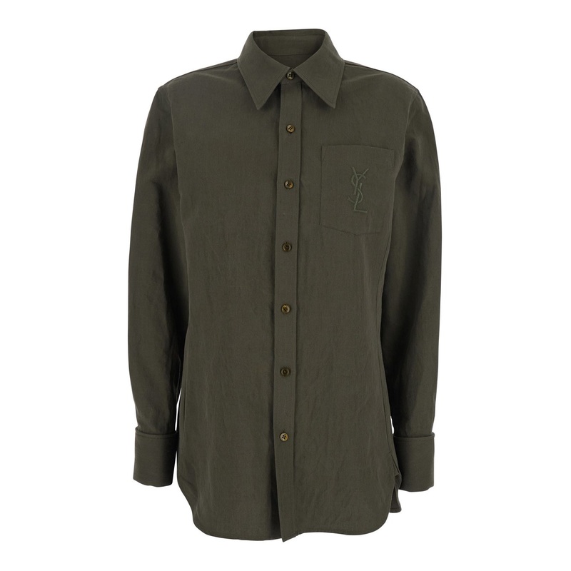 description" content=" shirt green classic collar long sleeves front button closure one front patch pocket cassandre embroidery on the pocket buttoned cuffs linen and cotton blen ...