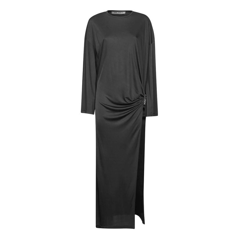 Crewneck Long flared sleeves, dropped shoulders Side gathered detailing at left hip; embossed silver-toned metal brooch Long side slit Asymmetric hemline Ankle length Regular fit Grey color 100% Viscose Made in Italy